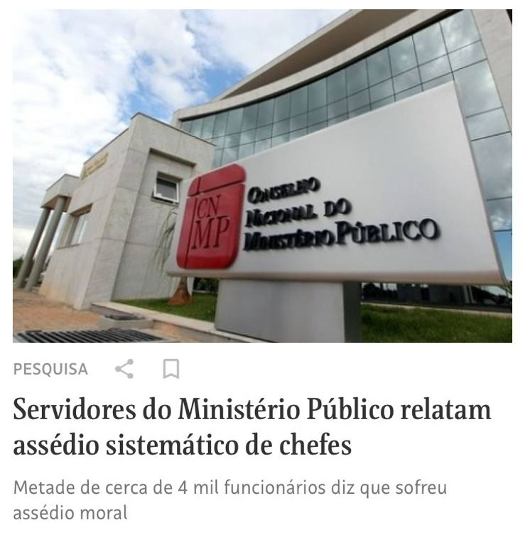 Repercutindo nacionalmente a realidade dos servidores do Ministérios Públicos estaduais, foi publicada reportagem na edição de sábado, dia 25, do jornal Folha de São Paulo em que metade dos trabalhadores ouvidos por uma pesquisa relatou ter sofrido assédio moral e/ou sexual no ambiente de trabalho.