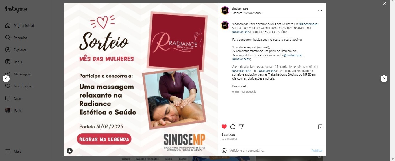 Para encerrar o Mês das Mulheres, o SINDSEMP sorteará um voucher valendo uma massagem relaxante na Radiance Estética e Saúde. Para concorrer, basta seguir o passo a passo das regras listadas na postagem original no Instagram, que você pode acessar clicando ou tocando aqui.