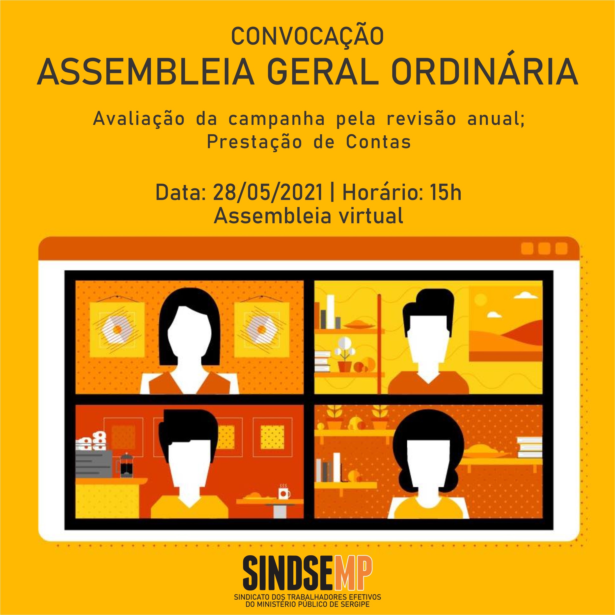 A Diretoria Executiva SINDSEMP-SE convoca a categoria para Assembleia Geral Extraordinária dos Trabalhadores Efetivos do Ministério Público de Sergipe (MPSE) a ser realizada, de modo virtual, no dia 28 de maio de 2021, com início às 15h em primeira chamada, e às 15h05, em segunda chamada, quando será discutida a seguinte pauta: