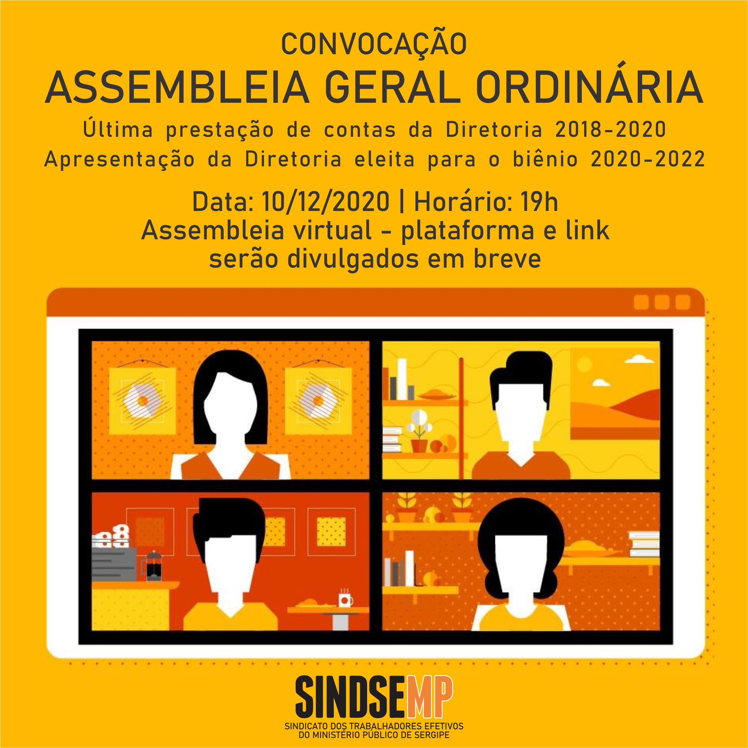 SINDSEMP-SE convoca a categoria para a Terceira Assembleia Geral Ordinária dos Trabalhadores Efetivos do MPSE a ser realizada, de modo virtual, na quinta-feira, 10 de dezembro de 2020, às 19 h em primeira chamada, e a segunda chamada às 19h05min.