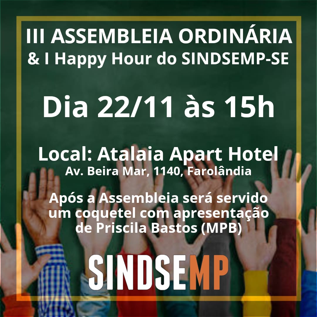 A Diretoria Executiva do SINDSEMP-SE convoca toda a base para Assembleia Ordinária dos Servidores Efetivos do MP-SE a ser realizada no salão de eventos do Atalaia Apart Hotel a partir das 15h, em primeira convocação, quando será discutida a seguinte pauta: