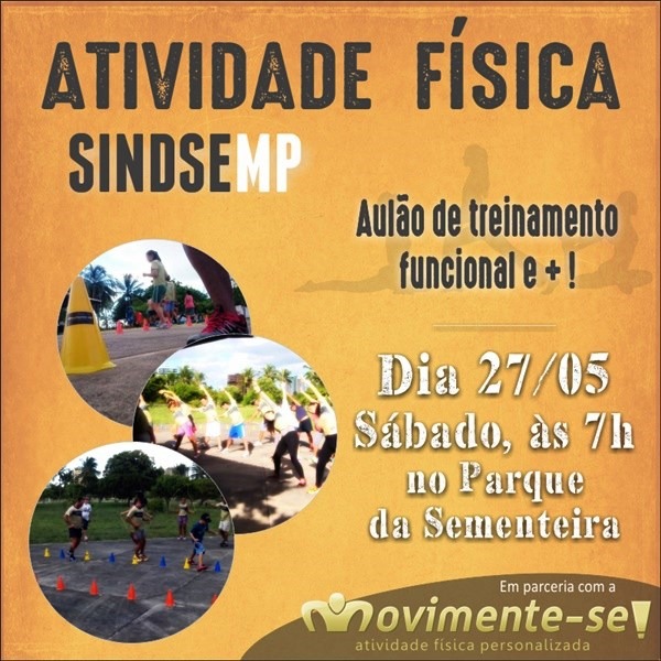 Informamos que o aulão de treinamento funcional com a Movimente-se está confirmado para sábado, dia 27/05, às 7h, no Parque da Sementeira. No local estaremos com bandeiras do SINDSEMP e bebidas!