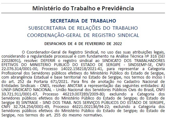 Foi publicado no Diário Oficial da União na segunda, dia 7, o Registro Sindical do SINDSEMP-SE, uma conquista histórica da entidade que representa os Trabalhadores Efetivos do Ministério Público de Sergipe (MPSE).