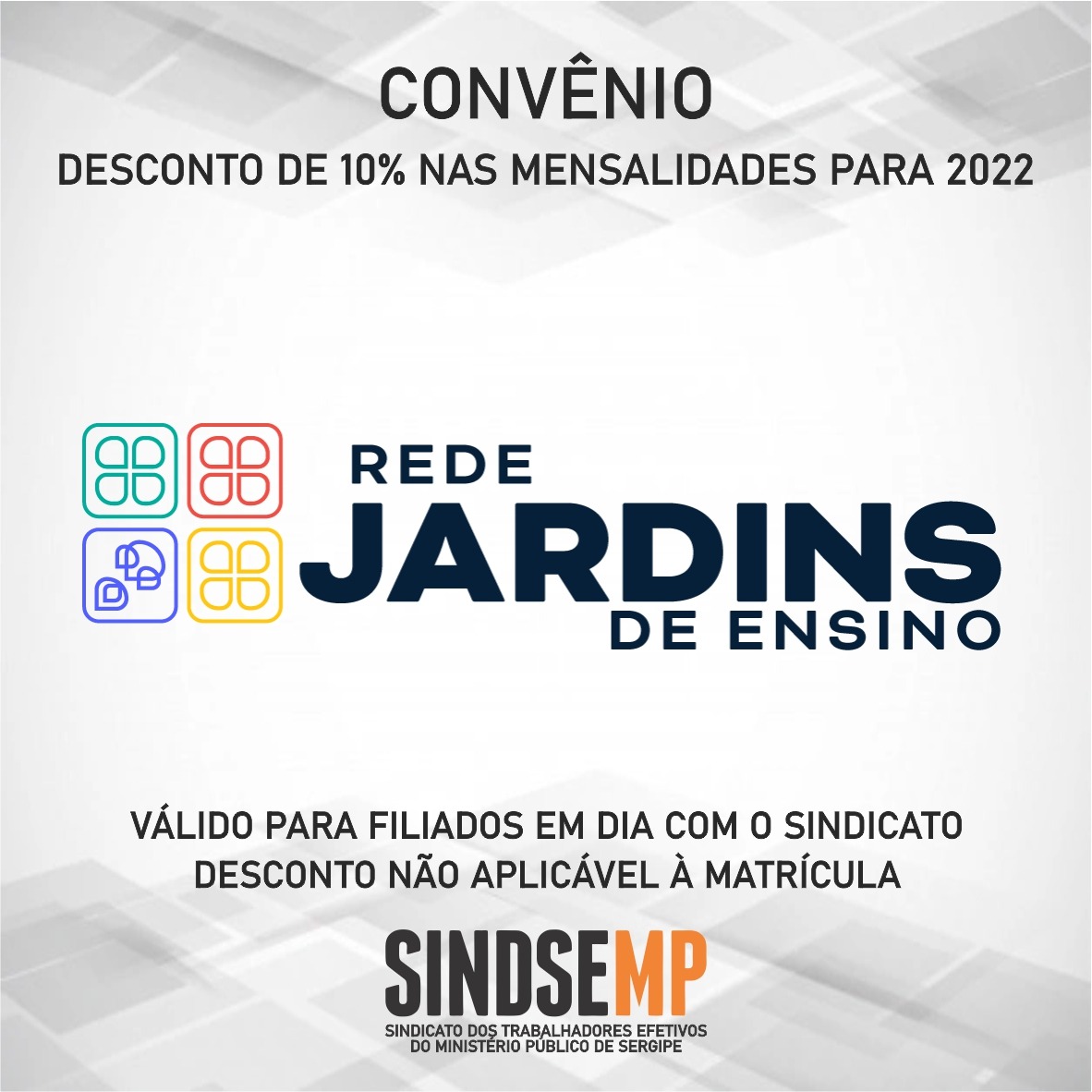 O SINDSEMP-SE conta com mais um convênio na área educacional para beneficiar seus filiados e filiadas. Agora, filhos e filhas de servidores devidamente em dia com o Sindicato terão direito a 10% de desconto nas mensalidades da Rede Jardins, importante grupo que conta com quatro unidades escolares em Aracaju.