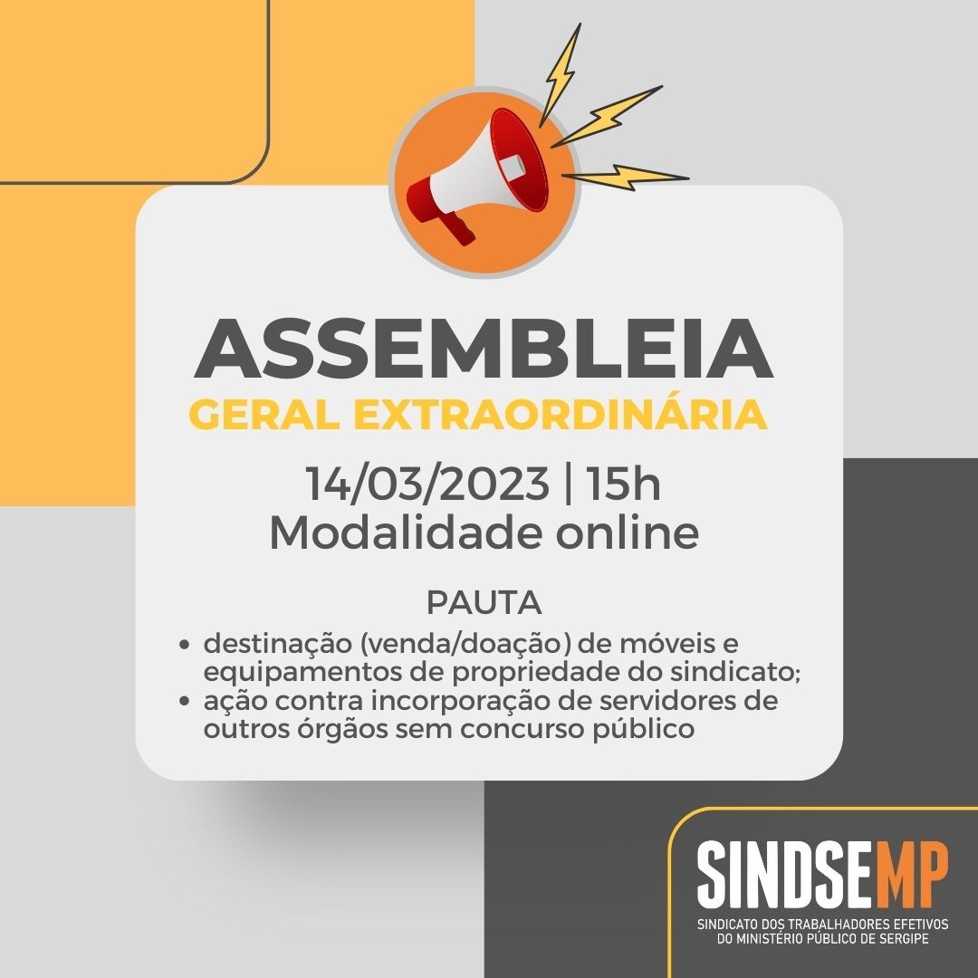 A Diretoria Executiva do SINDSEMP convoca a categoria para a Assembleia Geral Extraordinária dos Trabalhadores Efetivos do Ministério Público de Sergipe (MPSE) a ser realizada de forma virtual, no dia 14 de março de 2023, às 15h em primeira chamada e às 15h10 em segunda chamada, quando será discutida a seguinte pauta: