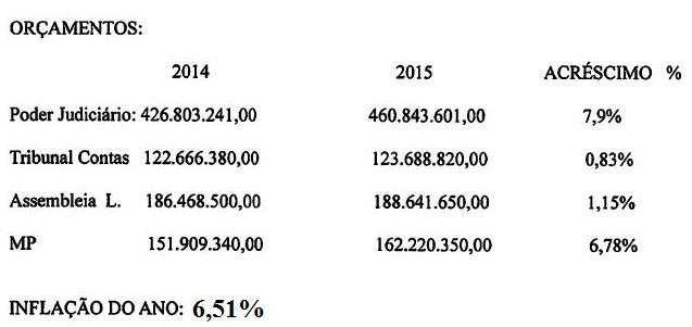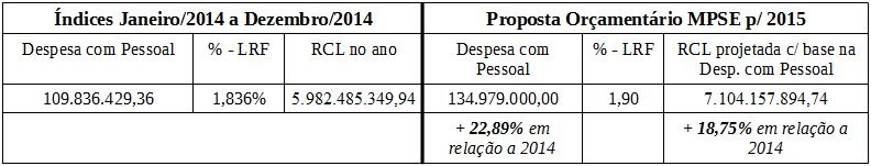 Analisando o quadro abaixo, vemos ainda que a proposta orçamentária para o ano de 2015 apresentada pelo MPSE (de R$ 134.979.000,00 para gasto com pessoal, conforme informado no Ofício Circular nº 824/2015 – GPGJ, de 24 de abril de 2015) previa um aumento de R$ 25.142.570,64 em relação à despesa com pessoal verificada no ano anterior (que foi de R$ 109.836.429,36 – Fonte: Portal da Transparência MPSE), o que representa um aumento de 22,89%, isto é, muito acima do índice inflacionário verificado no período (6,51%).