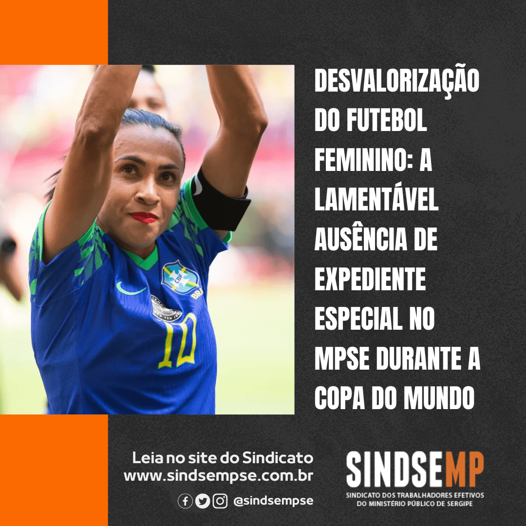 É lamentável que o Ministério Público de Sergipe (MPSE) não tenha decretado um expediente especial durante o jogo de estreia do Brasil na Copa do Mundo de Futebol Feminino que acontece nesta manhã de segunda-feira, dia 24, apesar de o SINDSEMP ter feito requerimento solicitando que adotasse essa medida. A oportunidade de acompanhar e torcer pelo sucesso das nossas jogadoras merecia o reconhecimento e respeito institucional, mas não houve resposta ao pedido.