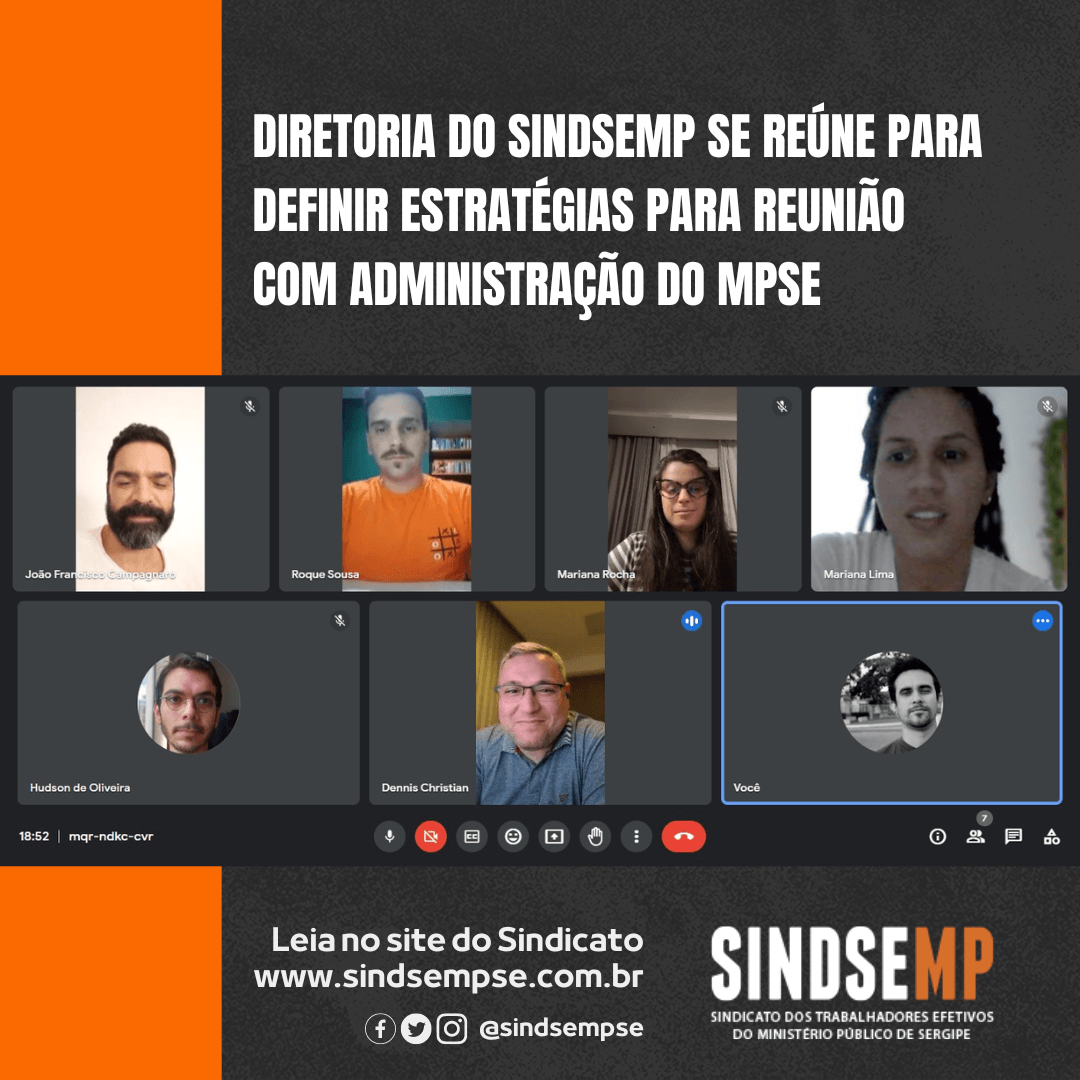 A diretoria executiva do SINDSEMP se reuniu de forma remota na tarde de segunda, dia 12 para discutir os assuntos que serão abordados na importante reunião com a administração do Ministério Público de Sergipe (MPSE) na manhã de terça-feira, dia 13. A reunião está agendada com o Procurador-Geral de Justiça (PGJ), Manoel Cabral Machado Neto.