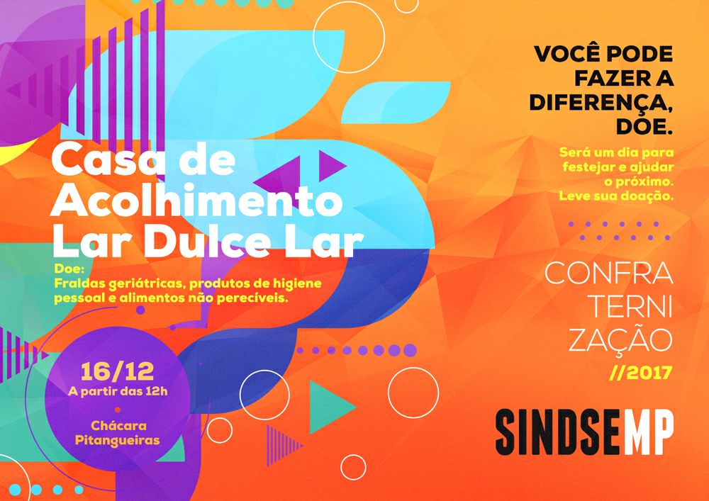 O SINDSEMP/SE, sempre pensando pautar a sua luta, sem se esquecer das causas sociais, bem como impulsionado pelo desejo de compartilhar alegria e amor, aproveita a confraternização marcada para o próximo dia 16 de dezembro, às 12 horas, na Chácara Pitangueiras, para arrecadar, opcionalmente, daqueles que se farão presentes no evento, alimentos não perecíveis, a exemplo dos itens comuns da cesta básica e lanches (biscoitos, sucos industrializados/em caixas, doces, achocolatados etc.), produtos de higiene pessoal e fraldas geriátricas.