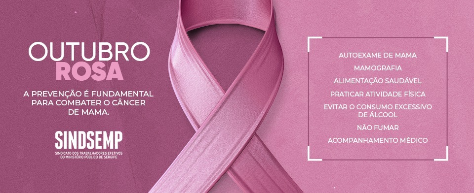 O SINDSEMP adere à campanha do Outubro Rosa lembrando que, mesmo com toda a conscientização e mobilização que acontecem no mês de outubro, a prevenção e os cuidados com a saúde da mulher devem ser uma preocupação ao longo de todo o ano.