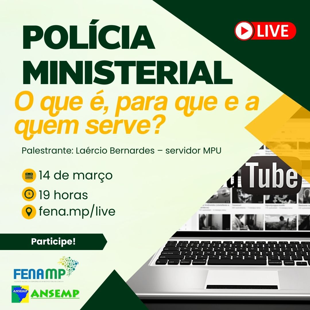 No dia 14 de março, terça-feira, às 19 horas, a FENAMP e a ANSEMP promovem a live “Polícia Ministerial: o que é, para que e a quem serve?”, com Laércio Bernardes – servidor MPU.