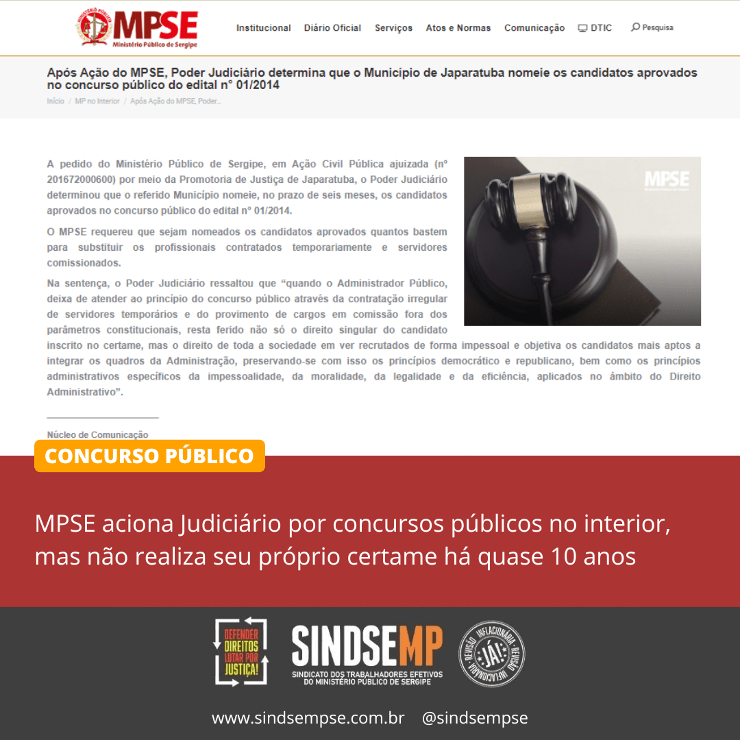 Apesar do silêncio quanto ao assunto em casa, nesta quinta, dia 15, o site do MPSE destaca notícia de uma ação ajuizada pela própria instituição em cuja decisão era determinado que a Prefeitura de Japaratuba nomeasse aprovados de concurso de 2014 e que não haviam ainda sido empossados.