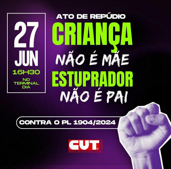 Contra essa absurda tentativa de criminalização das vítimas de estupro que recorrem ao aborto  legal, haverá um ato público convocado pela Central Única dos Trabalhadores (CUT-SE) na tarde de quinta, dia 27, às 16h30 no Terminal do DIA.