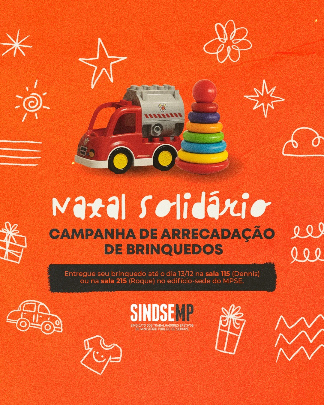 Com a aproximação do fim de 2023, o SINDSEMP lança campanha de arrecadação de brinquedos entre os Trabalhadores Efetivos do Ministério Público de Sergipe (MPSE). A iniciativa visa proporcionar momentos de alegria a crianças carentes e fortalecer a solidariedade entre a categoria.